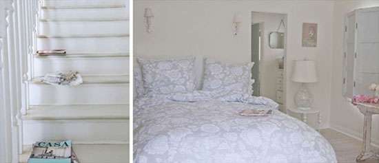 白色木樓梯上隨意地擺著幾本雜志,彰顯著不拘一格的生活態度。經樓梯來到樓上的客臥,風格一貫簡潔優雅,帶有印花的白色床品顯得更加別致。