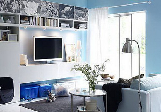 淺藍(lán)色的墻面溫和又清透,搭配白色的客廳家具、白色瓷磚地板,整個空間顯得特別清爽。電視柜和收納柜一體化設(shè)計,讓它成為了這個小客廳的一道風(fēng)景線。座位旁邊的落地?zé)艉托〔鑾咨系木G植都是客廳最好的點(diǎn)綴。