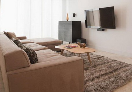 小空間里,越少的家具越能給人寬敞的視覺。只要一個大大的沙發(fā),搭配一個圓滑的木質(zhì)小茶幾,這個沙發(fā)區(qū)寬敞又舒適。掛墻的液晶電視也為地面減輕了負(fù)擔(dān),旁邊的木質(zhì)收納柜可以放些常用的客廳用品。這樣,一個簡潔明快又素雅的客廳就形成了。不過,這樣的設(shè)計不太適合雜物太多的家庭。