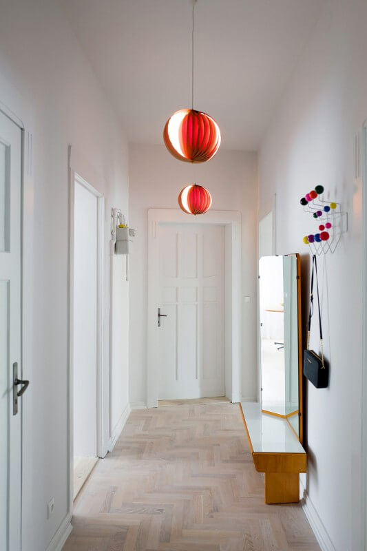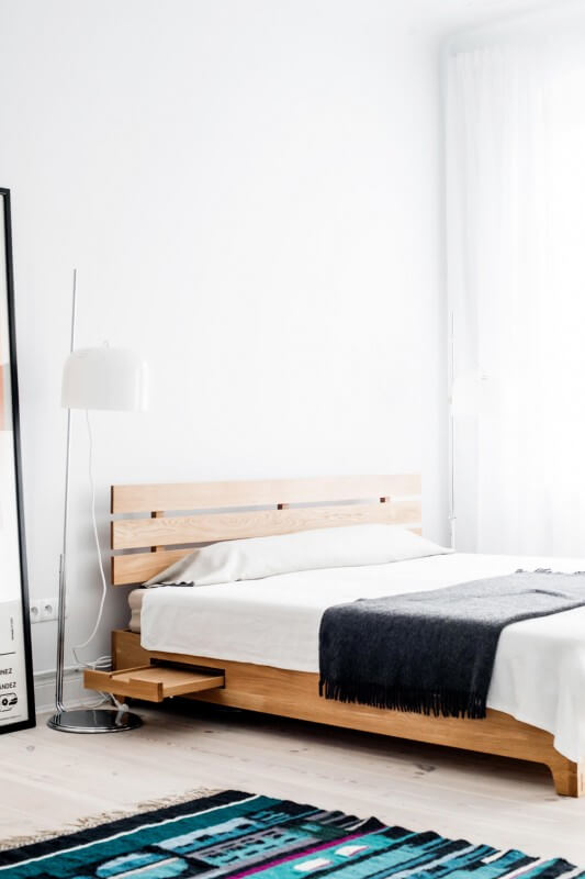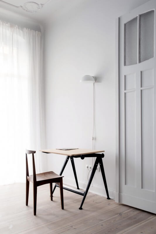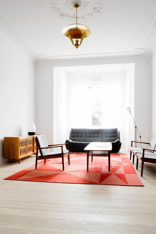 整間房子的軟裝,主要聚焦于歐洲中世紀的設計理念。燈源集合了來自波蘭、法國、意大利及捷克的多個品牌。床品由Loft Kolasinski室內設計師自行設計,主材為油橡木。客廳的地毯是Antonin Kybal上世紀60年代的設計作品。木質家具系列則由Grete Jalka制作。為了視覺完整性,墻邊還放置了一張1986年電影《斗牛者》的街頭海報相框。