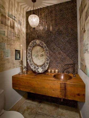 復古花紋的瓷磚拼貼,本就給盥洗池別樣風情,創意的使用不規則的鏡面裝飾,讓空間錯離在鏡面的折射里,面積不大的空間里用一個小巧而精致的吊頂替換普通的燈具,更助于營造氛圍。