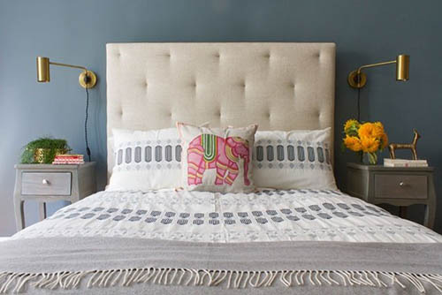 床上用品也不可隨意,帶有花紋點綴的白色床品顯得優雅簡約,同時也是對房間深藍色調的中和。一只印有粉色大象圖案的抱枕,成了空間中的點睛之筆。