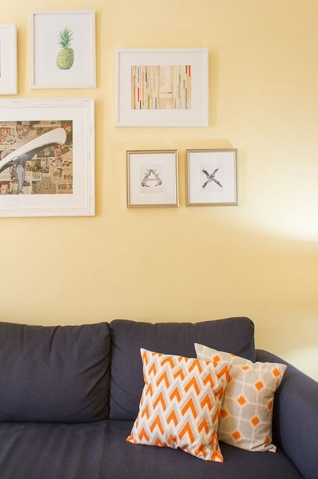 兩只帶有橙色花紋的抱枕與深色沙發形成對照,同時與橙色茶幾相呼應,挑出色彩亮點。沙發背景墻上多幅不同大小的裝飾畫排列組合,讓墻面豐富多彩。