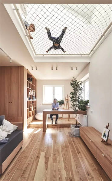 最有創意的就是網格的設計,代替了原本的吊頂天花板,成為孩子的游樂場、大人的休憩地。