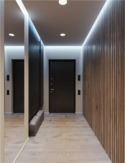 入門玄關(guān)處理得十分簡潔,設(shè)計(jì)師力求每一個(gè)面都能展現(xiàn)高級感,左手邊的墻面使用木飾面拼接,刻意凸出紋理感,對面深色隱藏式鞋柜,則與墻面保持平整保證左右平衡。