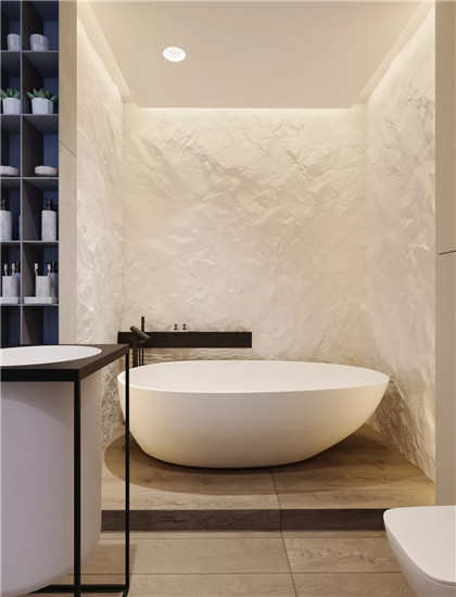 將淋浴區(qū)放置在了入門處,從頂部降落的泛光燈,猶如天光一般灑下,緩解了深色木飾面帶來的壓抑感。