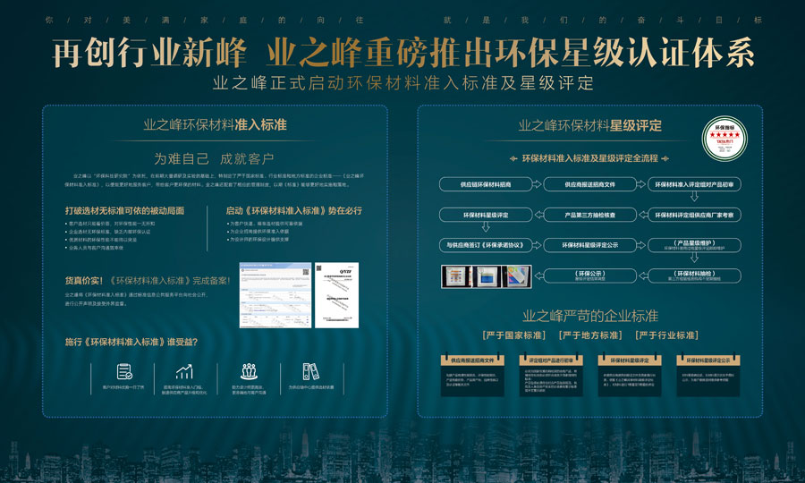 第三步,業(yè)之峰會對環(huán)保材料進行星級評定,依據(jù)供應商提供的報送文件及國家現(xiàn)行標準,依據(jù)《業(yè)之峰環(huán)保材料星級評定標準》,對材料進行1顆星至5顆星的評定。