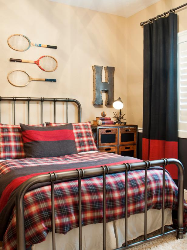 對于有傳統品味的青少年來說,在臥室里搭配經典的格子圖案是不會錯的。從格子床罩開始,就像這個空間里看到的那樣。然后從圖案上拉出顏色來選擇抱枕、窗簾等配件。古董網球拍和一個超大的金屬初始完成的房間的鄉村外觀。