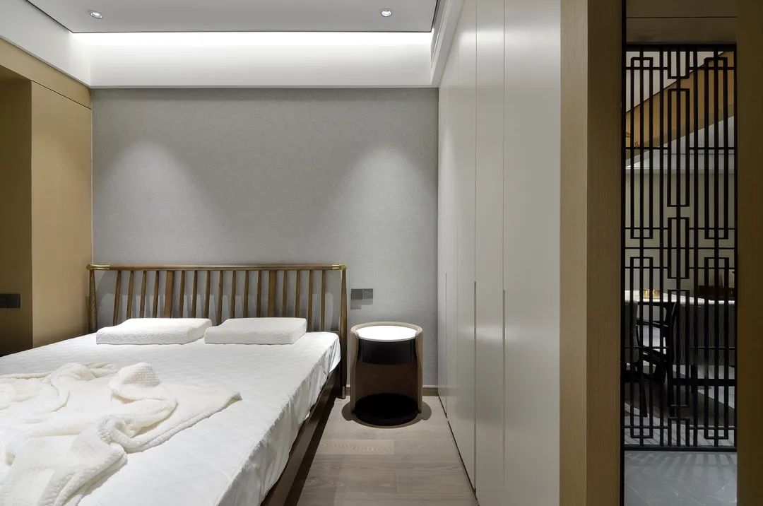 ▲次臥以灰色的床頭墻,布置鏤空的胡桃木靠背床,干凈素雅的床單,極簡的衣柜造型,簡單而不失優雅質感。