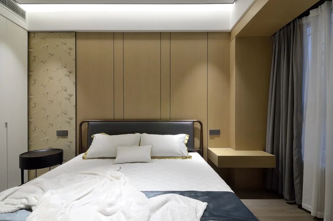 ▲床頭墻左側加入銀杏葉的墻布,旁邊布置圓形的黑色床頭柜,也是顯得更加儒雅端莊。