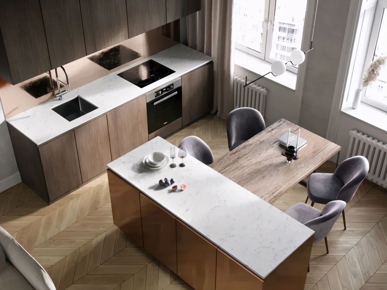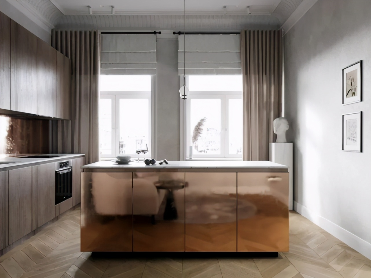 帶著弱肌理感的水泥灰調墻面底色,讓空間有了一絲厚重感。木紋和黃銅質感碰撞的櫥柜,細膩和溫潤尺度拿捏的剛剛好。