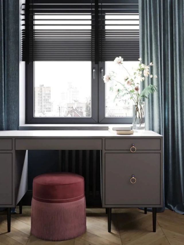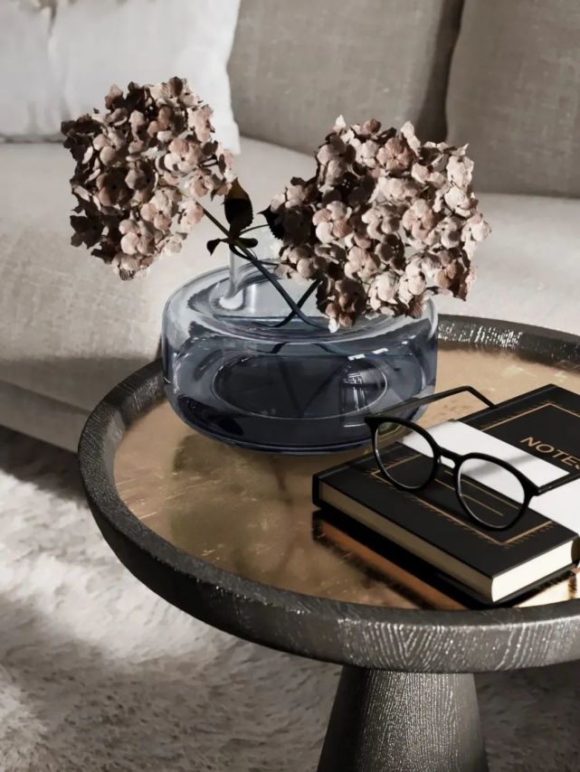 低飽和度的窗簾、泛著歲月光輝的銅、瓶插的兩支繡球干花,不同質感的粉色奏出一種韻律,讓空間變得柔軟。