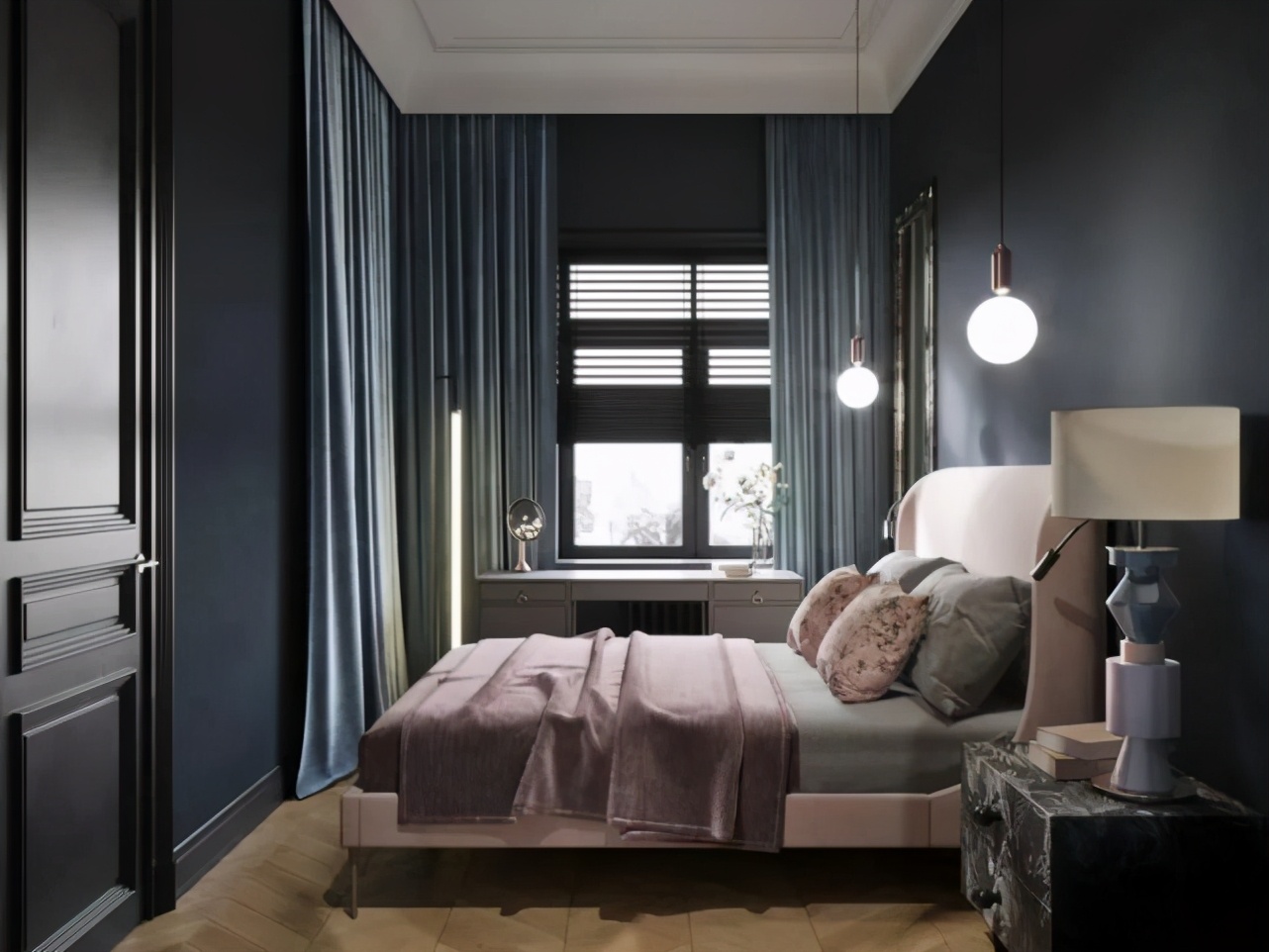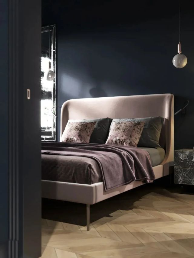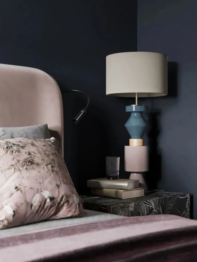 主臥室靜謐的藍色墻面,帶來深邃悠遠的氛圍。皮粉色的軟包床做并不強烈的補色對比,提亮了空間的明度。仿佛在縹緲的遠方和溫存的現實之間踱步,思緒綿長。