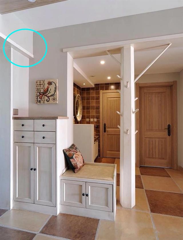 除了個別憑空出現在房間中央的梁以外,大多數房梁都是隱藏在隔墻里的。比如下圖▼