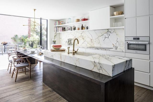 有些材料和飾面比其他材料更能給你帶來你可能想要的豪華廚房的感覺。白色大理石,尤其是有明顯紋理圖案的大理石,在這種情況下是一個非常好的選擇。搭配堅實的木材,中性和極簡的形狀來達到平衡。這個美妙的設計是由斯圖爾特-謝弗工作室完成的。