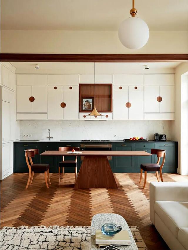 室內設計工作室Colombe在華沙翻新了一套公寓,并給了它一個非常漂亮的廚房,我們發現它非常迷人。這是一間開放式的廚房,鋪著兩種色調的人字形地板,一張雅致的桌子也可以作為一個獨立的島臺,還有兩種截然不同的配色方案的櫥柜。我們喜歡在整個空間中融入木材的方式。