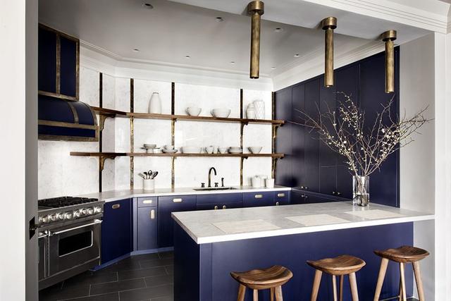 這個廚房的調色板也很有趣。墻壁是白色的,這設置了一個干凈明亮的背景,與此形成對比的是,櫥柜的特點是深藍色的色調,似乎創建了一個平滑的過渡到黑暗的地磚。當然,不只是這樣。所有的古董金屬細節都增加了空間的個性,與廚房角落的櫥柜和島臺相結合。這是由Gramercy設計的室內設計。
