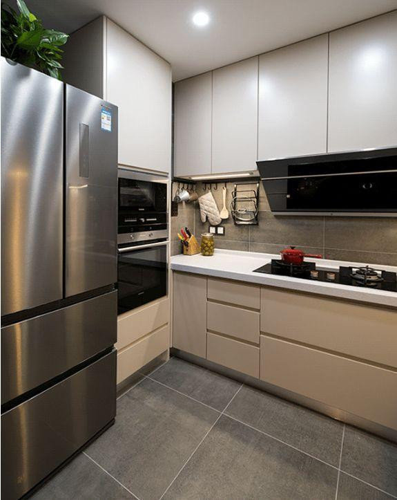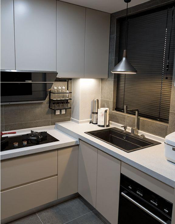 廚房內(nèi)部白色平面的櫥柜門,菱角分明的線條看起來很有層次感也很美觀。