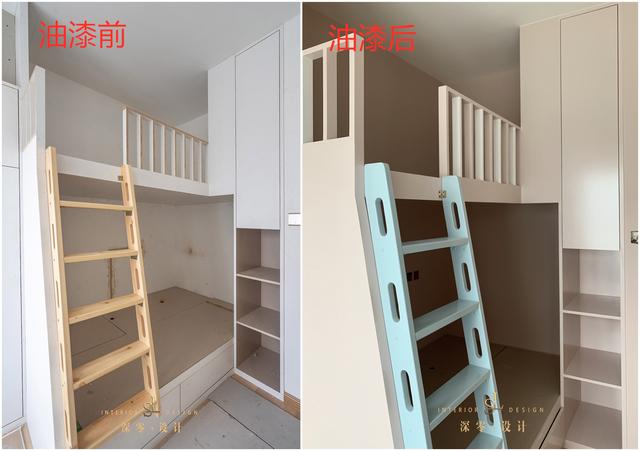 給大家看看上漆前后的對比,是不是更貼近設計圖了!床頭一側的柜子旁局部留空,代替床頭柜,這個小細節可以說十分到位了。