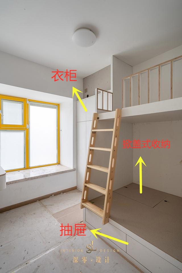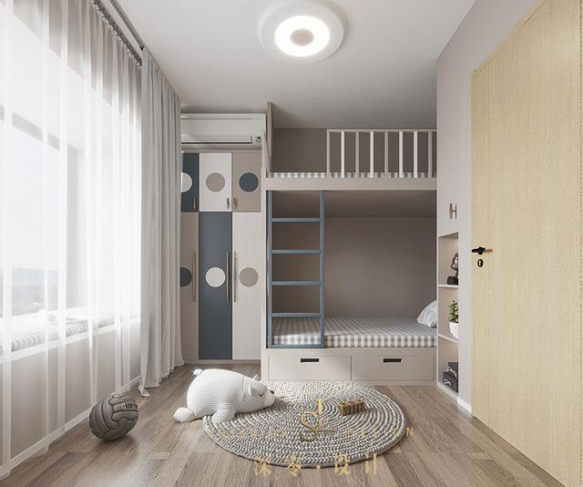 下面這個是我給出的3D效果圖,索性兒童房有個飄窗,采光不需要擔心,上下高低床連著衣柜一起打,省面積不說,該有的功能一樣沒少。