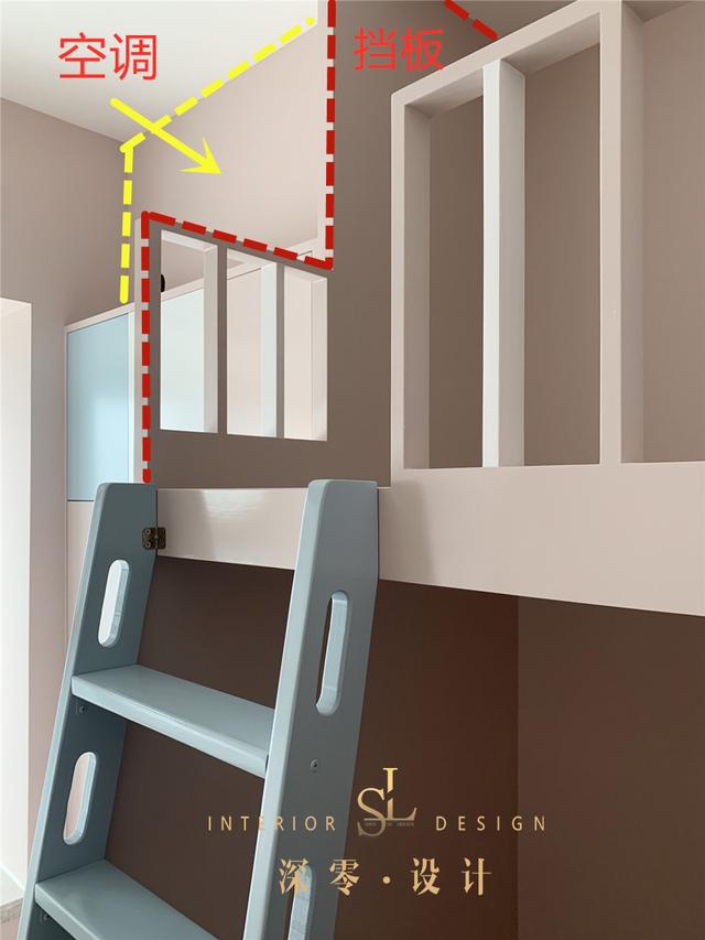 上下床連著衣柜,頂部空出來是專門放空調的,需要注意下,畢竟是孩子住的,冷風直吹容易受涼,側邊延伸擋板做到頂,這樣一來即便睡在上鋪,大人也能放心很多。梯子2側有鏤空,方便孩子上下抓得更加牢固些。