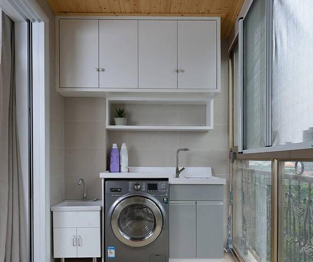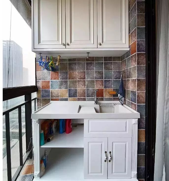 上圖的陽臺柜子也設計得很實用,中間還做了一個擱架,可以擺放一些小盆栽,上面柜子又能儲藏東西,下面還做了個洗拖把水池。