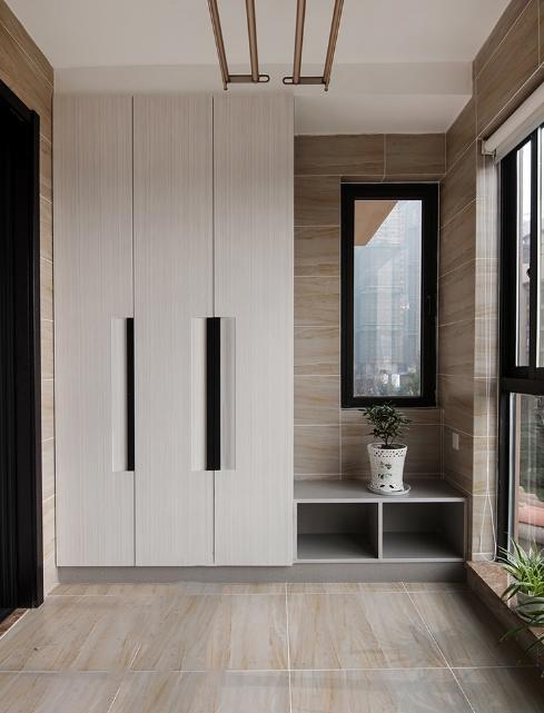 如果家里的陽臺面積比較大的話,那可以做一面大點的柜子,平時用不上的被褥衣服統一放置在這里,臥室的衣柜就不會顯得那么擁擠不堪。