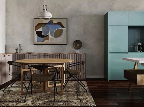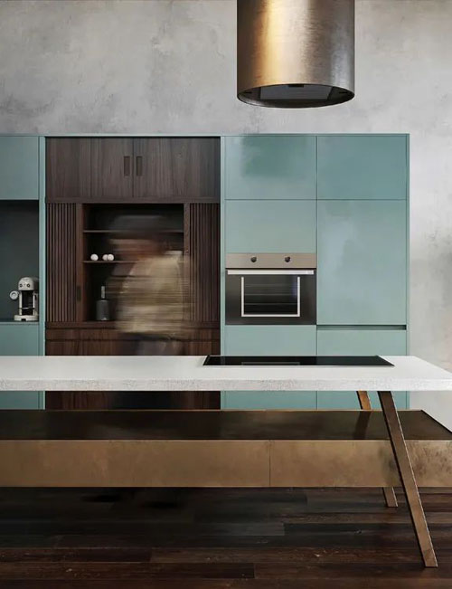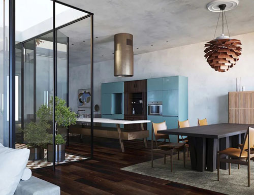 住宅整體色調以木色為主,在開放式廚房中用綠松石色的櫥柜作點綴,給室內空間提供了他溫馨且明亮的視覺效果,用柔和的色調和清晰的線條打造內斂美學。
